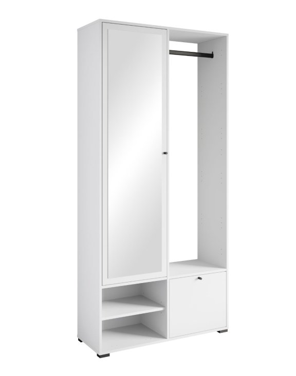 Šatní skříň do předsíně Dino v bílé barvě od značky Bratex je elegantní, moderní a mimořádně funkční kus nábytku, ideální do předsíně, garsonky nebo hotelu.
