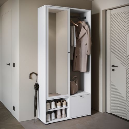 Na levé straně se nachází uzavíratelný oddíl s policemi, který umožňuje přehledné uložení různých doplňků, jako jsou čepice, šály nebo jiné drobnosti. Police jsou navrženy tak, aby pojmuly předměty různých velikostí.