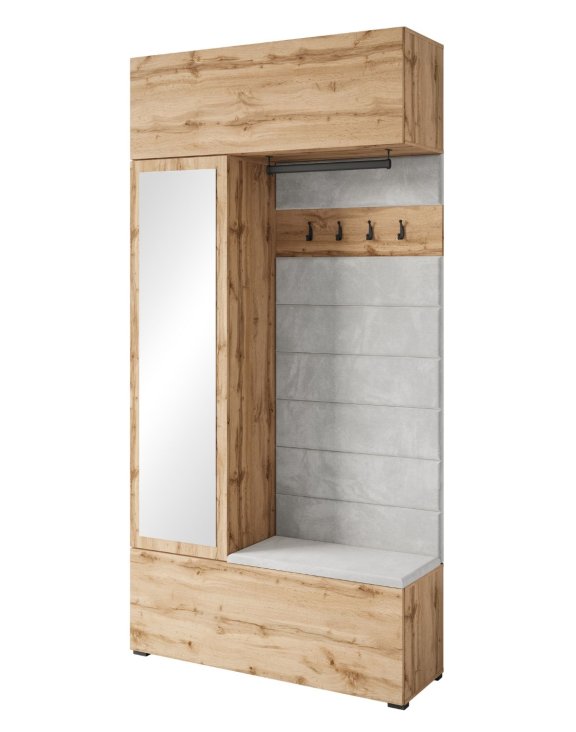 Středová otevřená část sestavy slouží pro každodenní použití. Nachází se zde čtyři pevné háčky na oblečení a šatní tyč pro pohodlné zavěšení kabátů či bund. Celek doplňuje měkký sedák a opěradlo čalouněné látkou (Mono 24) ve světle šedém odstínu.