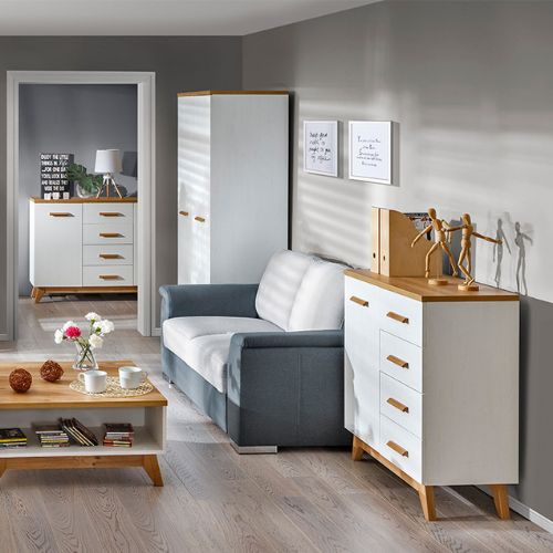 Dvoudveřová šatní skříň s tyčí na oblečení z kolekce Sven zaujme na první pohled. Model je vyhotoven v barevném provedení borovice andersen, které je doplněno výraznými doplňky v odstínu dub nash, jež dodávají nábytku teplo a osobitý charakter.