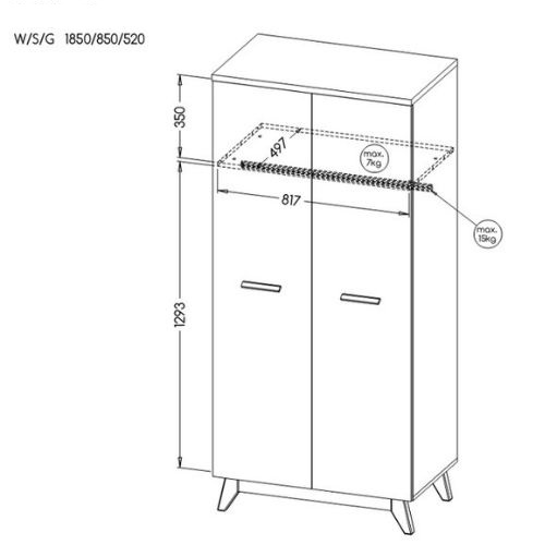 Dvoudveřová šatní skříň je vybavena prostornou tyčí, na kterou snadno zavěsíte oděvy vyžadující skladování ve visu, a policemi, které umožňují přehledné uložení oblečení nebo doplňků, které právě nepoužíváte.