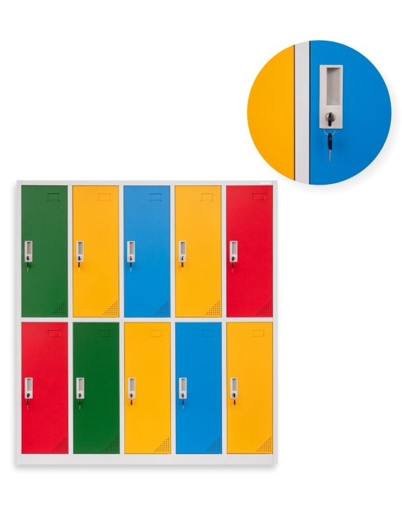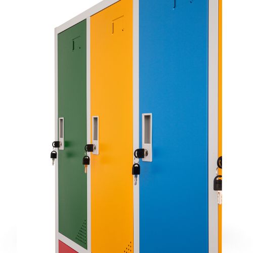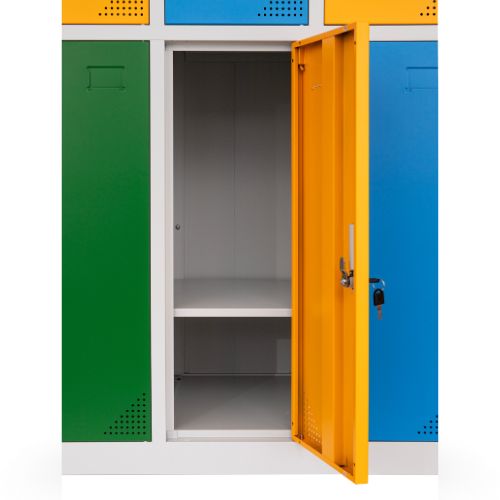 Každá přihrádka je vybavena vačkovým zámkem na klíček, který zajišťuje bezpečnost uložených věcí, a decentní perforace v rozích dvířek umožňuje ventilaci vnitřního prostoru.