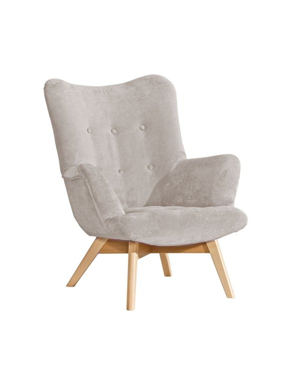 Skandinávské křeslo ušák Safin na vysokých nožkách představuje design inspirovaný přírodou – měkké linie opěradla a dřevěná základna vytvářejí harmonický celek.