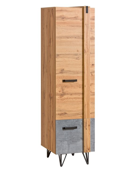 Skříň Lofter LO2 je ztělesněním moderního designu v industriálním stylu. Její surový, loftový charakter podtrhují čelní plochy kombinující teplý dekor dubu s chladným odstínem betonu – tato dvojice vytváří mimořádně stylové a harmonické spojení, které se skvěle hodí do moderních i industriálních interiérů.