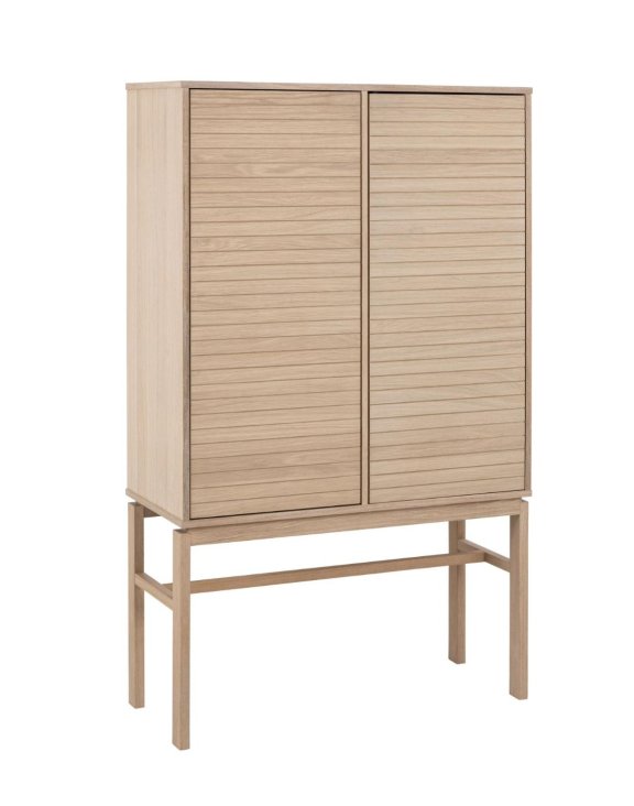 Skříňka má 4 police a dvířka s lamelovým čelem a funkcí otevírání zatlačením.
