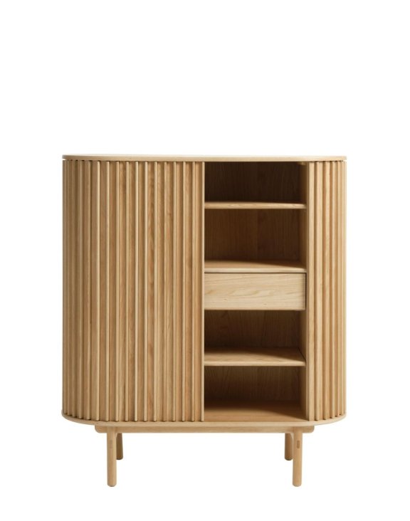 Matný povrch v odstínu přírodního dubu spolu s zaoblenými tvary a čelními lamelami s integrovanými úchyty podtrhují řemeslný charakter nábytku a severskou eleganci.