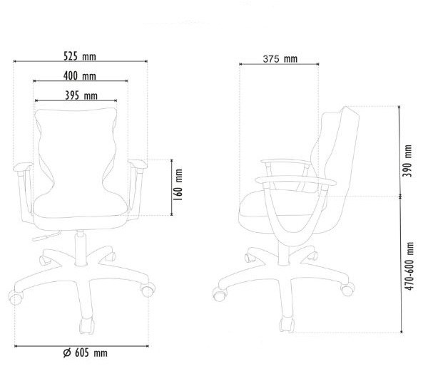 Rozměry: šířka židle s područkami 525 mm, šířka sedáku 400 mm, šířka opěradla 395 mm, průměr základny 605 mm, výška područek 160 mm, hloubka sedáku 375 mm, výška opěradla 390 mm, nastavení výšky 470–600 mm.