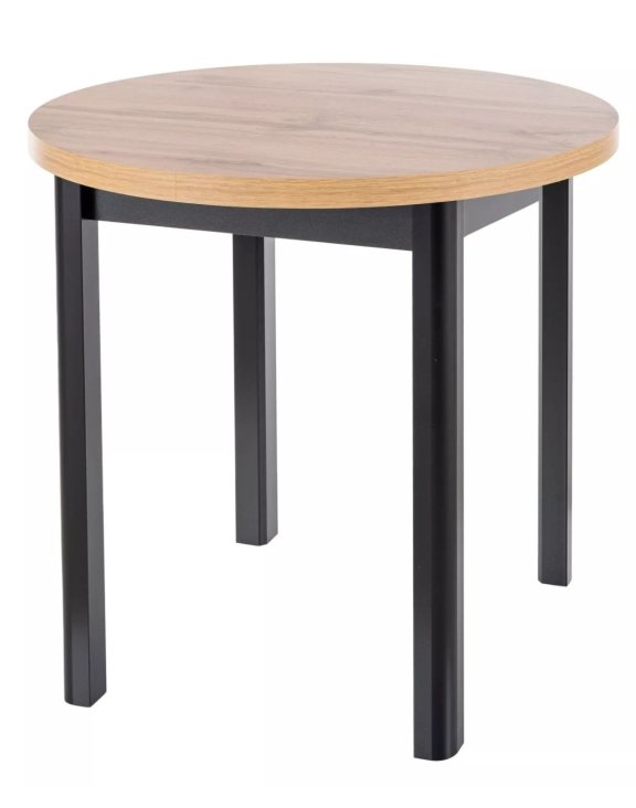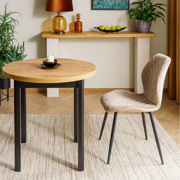 Kulatá deska v dekoru dub artisan a pevná podnož z MDF v barvě černý mat vnesou do vaší jídelny útulný a harmonický nádech.