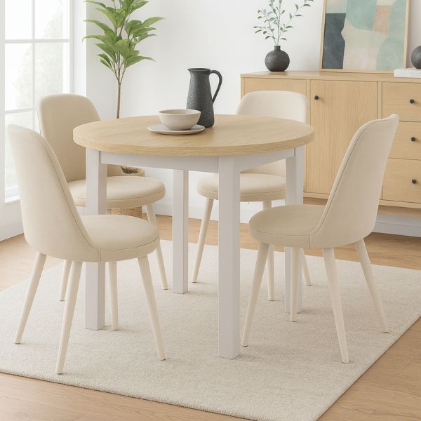 Kulatá deska v dekoru dub cremona a pevná podnož z MDF v barvě Kašmír vnesou do vaší jídelny útulnou a harmonickou atmosféru.