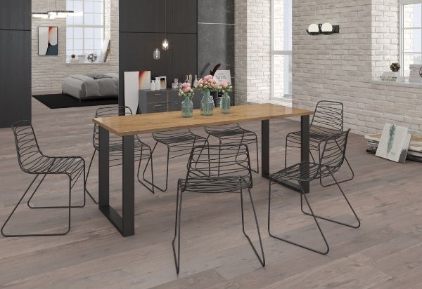 Deska o tloušťce 28 mm zajišťuje výrazný vzhled a vysokou odolnost, zatímco kovové nohy z profilu 80 × 40 mm, práškově lakované v černé barvě, dodávají stolu moderní a čistý charakter.