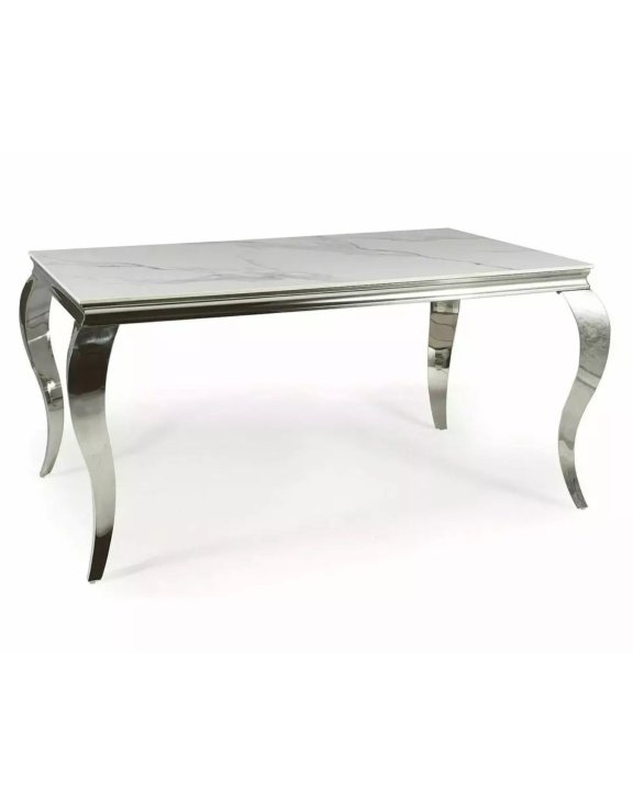Deska z vysoce kvalitní keramiky v dekoru Calacatta zaujme nadčasovým mramorovým vzorem, zatímco ohýbané nohy z leštěné nerezové oceli v barvě chromu dodávají stolu nádech glamour stylu.