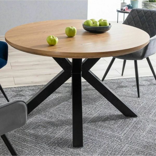 Kulatá deska o průměru 120 cm je vyrobena z MDF desky s dýhou v dekoru dubu s výraznou kresbou letokruhů, která mu dodává jedinečný charakter a eleganci.