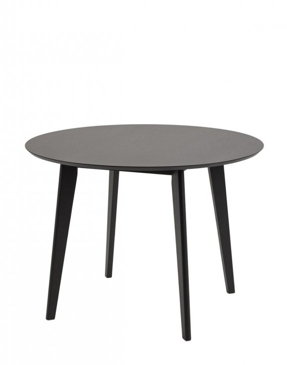 Deska stolu o průměru 105 cm je vyrobena z dýhované dubové desky a rám z kaučukového dřeva. Všechny prvky židle jsou mořeny černou barvou.