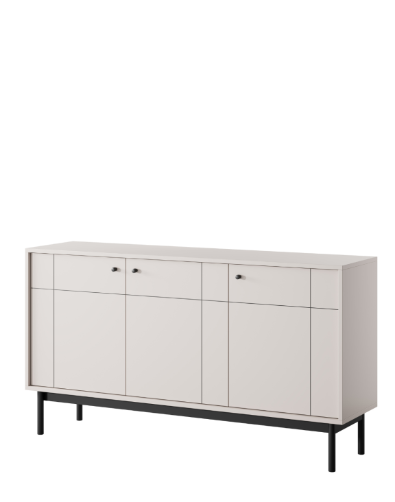 Třídveřová komoda Japandi K154 v barvě kašmír od značky Piaski je stylový a funkční kus nábytku, dokonale zapadající do estetiky japandi.