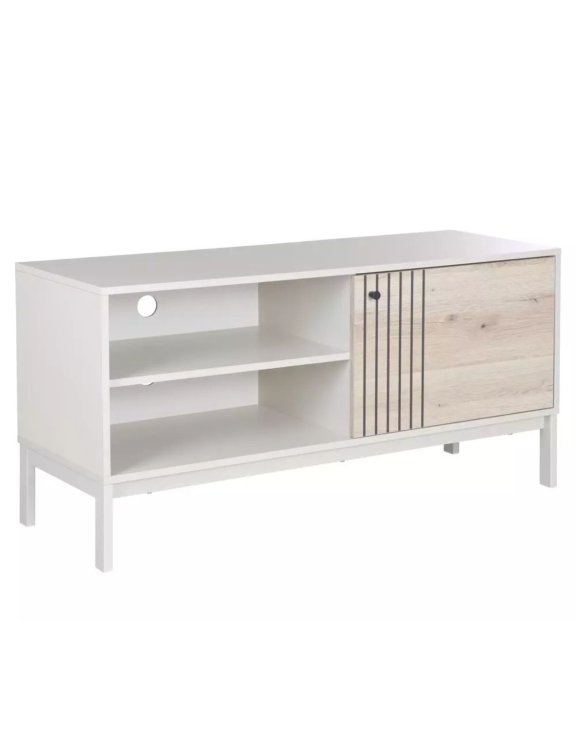 Vysoká funkčnost – 2 otevřené police s otvory na kabely + 1 prostorná skříňka s dvířky.