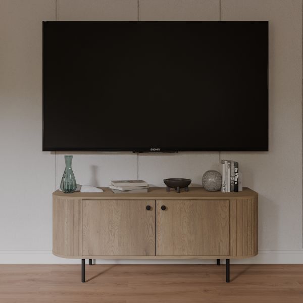 Model je vybaven dvěma dvířky s tichým dovíráním, za nimiž se nachází prostorná police ideální pro uložení elektroniky, kabelů nebo multimediálního příslušenství.