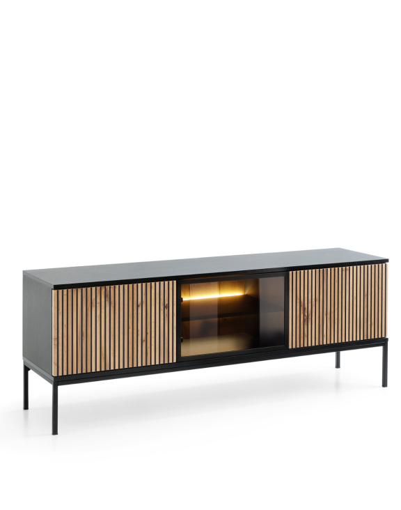 TV skříňka Sento (RTV154) značky Piaski, třídveřový s LED osvětlením v barvách černá a dub wotan je elegantní a funkční nábytek, ideální do moderních interiérů.