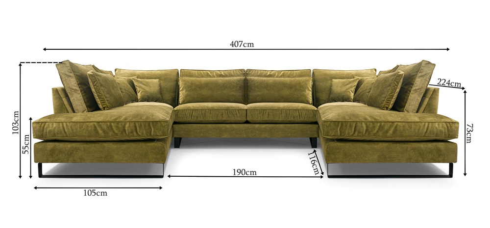 Rozměry: Šířka 407 cm, výška 103 cm, hloubka 224 cm. Výška sedáku 55 cm.