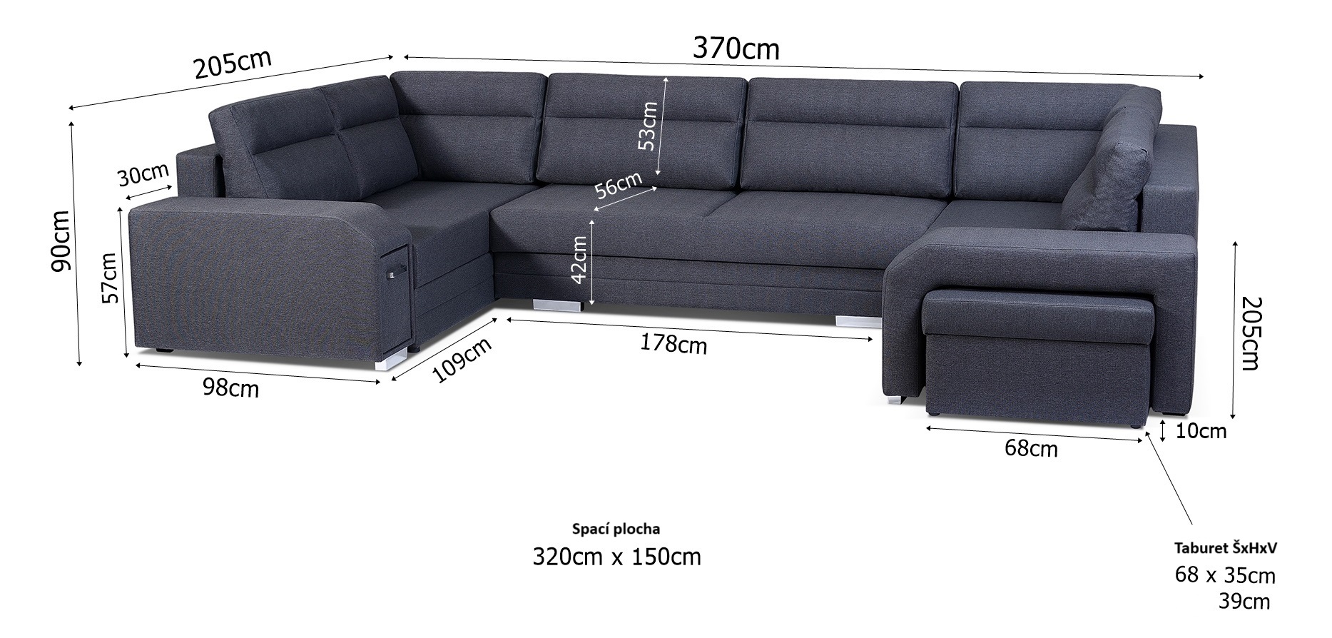 Rozměry: Šířka 370 cm, výška 90 cm, hloubka 205 cm. Výška sedáku 42 cm.