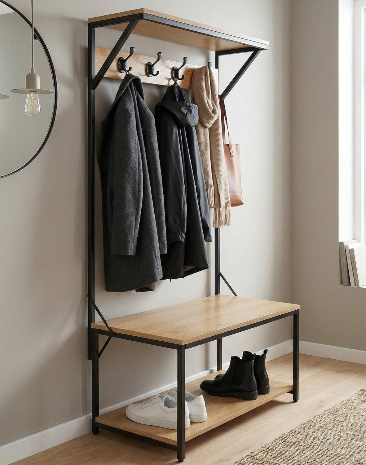 Působí jako věšák s policemi a sedátkem, což se hodí zejména do malých prostor.