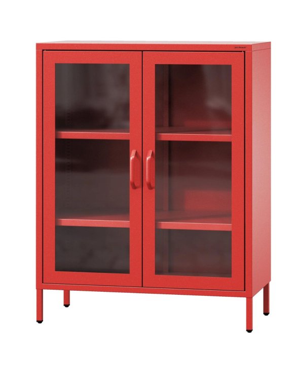 Vitrína do obývacího pokoje Gina na nohách v červené barvě je synonymem elegance.