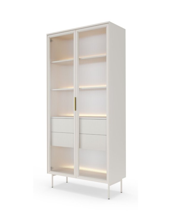 Elegantní komoda Lumi B v barvě Kašmír s LED osvětlením a čely ze skla flutes. Zlaté úchyty a kovové nohy v kašmírové barvě dodávají moderní šmrnc.