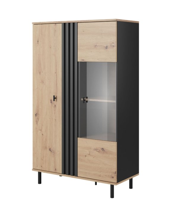 Moderní komoda s vitrínou Madis E o šířce 165 cm v kombinaci dub artisan a antracit. Prosklená čela, stylové MDF lamely a možnost LED osvětlení vytvářejí elegantní kus nábytku ideální pro vystavení dekorací. Dodejte svému interiéru výrazný designový akcent.