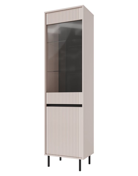 Charakteristické vertikální frézování na čelech dodává vitríně osobitý výraz, zatímco prosklená horní část umožňuje elegantně vystavit porcelán, sklo nebo dekorace.