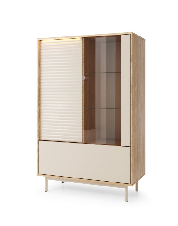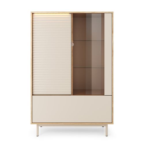 Vitrína Tila TI1 na nožkách je harmonickým spojením moderního minimalismu a jemné elegance. Je laděna v módním odstínu Kašmíru a olejovaného dubu.
