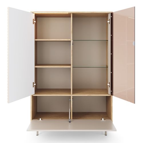 Vnitřní prostor vitríny byl pečlivě navržen – víceúrovňové police umožňují optimální využití prostoru. Uzavíratelná část je ideální pro ukládání dokumentů, domácích textilií nebo méně používaných doplňků.