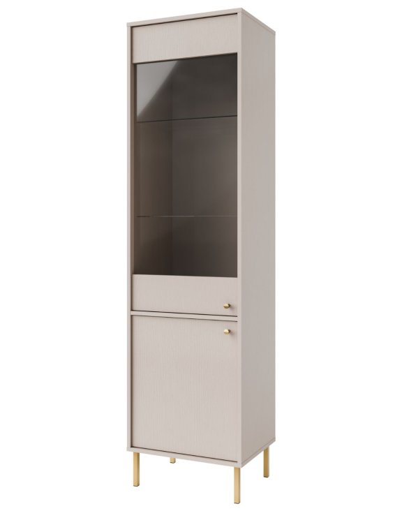 Vitrína Tokyo 2 (101) v jemném pískově béžovém odstínu dokonale propojuje moderní minimalismus s přirozeným půvabem a skvěle se hodí do obývacího pokoje, jídelny i pracovny.