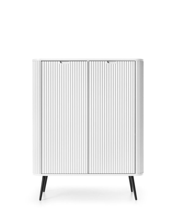 Vysoká dvoudveřová komoda Zova (K103) do obývacího pokoje značky Piaski je stylový a moderní kus nábytku s elegantním designem v bílé barvě.