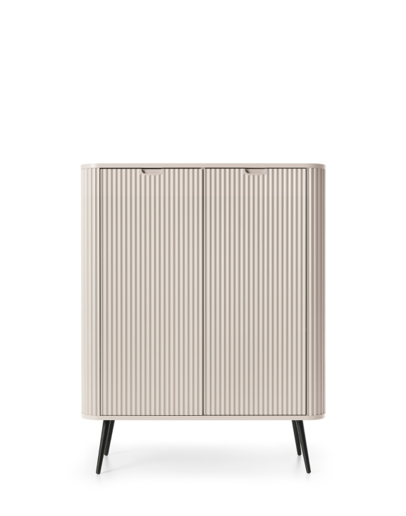 Vysoká dvoudveřová komoda Zova (K103) do obývacího pokoje značky Piaski je stylový a moderní kus nábytku s elegantním designem v barvě kašmíru s černou konstrukcí.