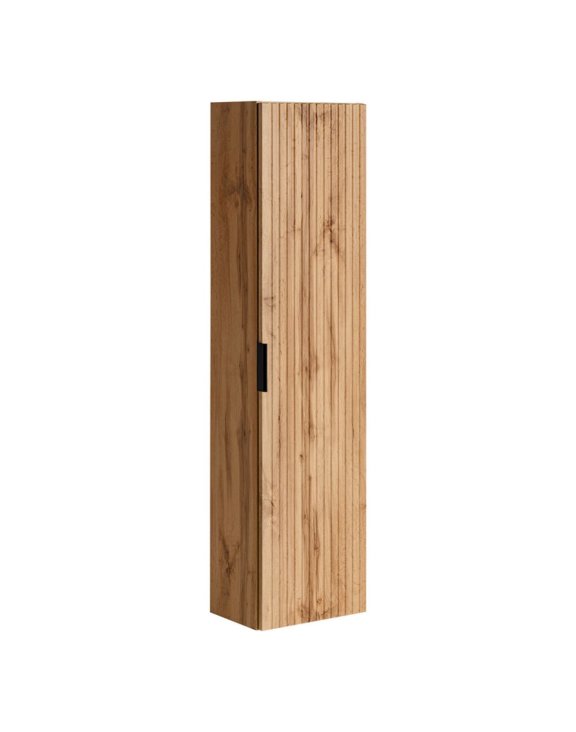 Vysoká koupelnová skříňka Adel Oak s jedněmi dvířky usnadňuje udržování pořádku v koupelně a odpovídá současným designovým trendům.