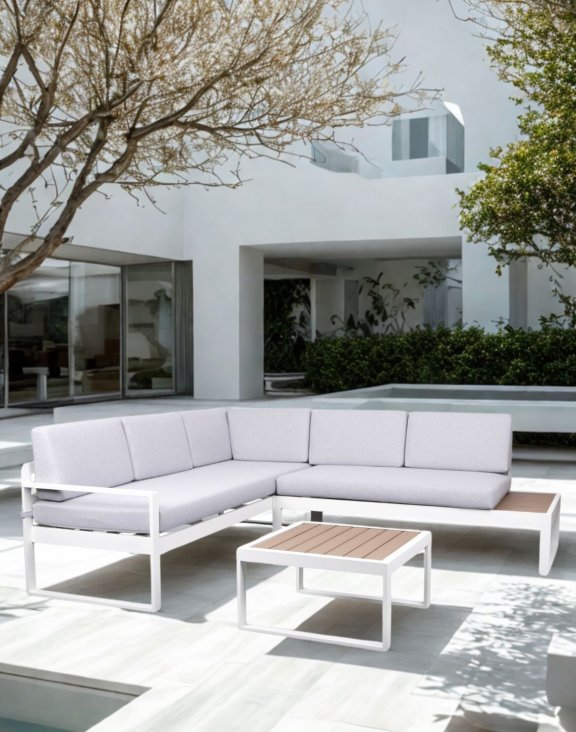 Konstrukce soupravy je vyrobena z práškově lakovaného hliníku v bílé barvě, což dodává sestavě elegantní a moderní vzhled a zároveň zajišťuje odolnost vůči dešti, slunci a proměnlivému počasí.