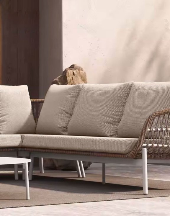 Opěradlo rohové pohovky je vyrobeno z výpletu imitujícího přírodní provaz v přírodní barvě, vyzařuje eleganci a uživatelský komfort. Jeho konstrukce ze silného 7mm technoratanu zajišťuje výjimečnou odolnost a snadné čištění.