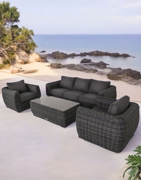Navíc, silné polštáře v grafitové barvě z polyesteru zajišťují nejen pohodlí, ale také kontrastují s ratanovými prvky.