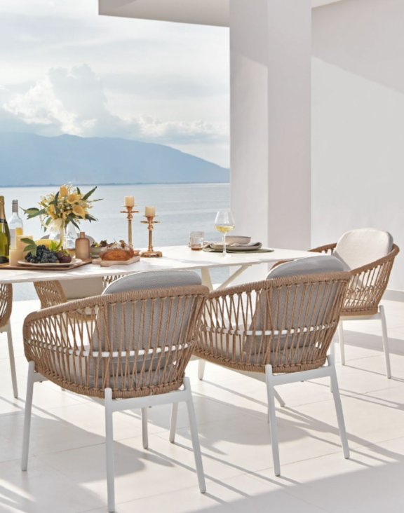 Díky konstrukci z silného 7mm technoratanu je sestava mimořádně odolná a snadno se čistí. Celá konstrukce je vyrobena z hliníku, lakovaného práškovou barvou v elegantním odstínu ivory, což zajišťuje stabilitu a odolnost vůči povětrnostním podmínkám.