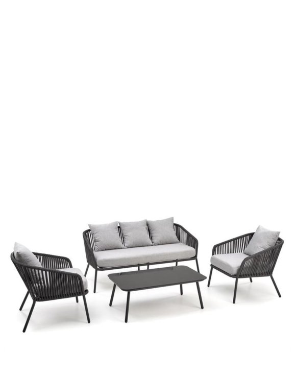 Sada obsahuje pohovku a dvě křesla, která jsou opletena tmavě šedým lanem, dodávajícím nábytku moderní design, a stůl se skleněnou deskou.