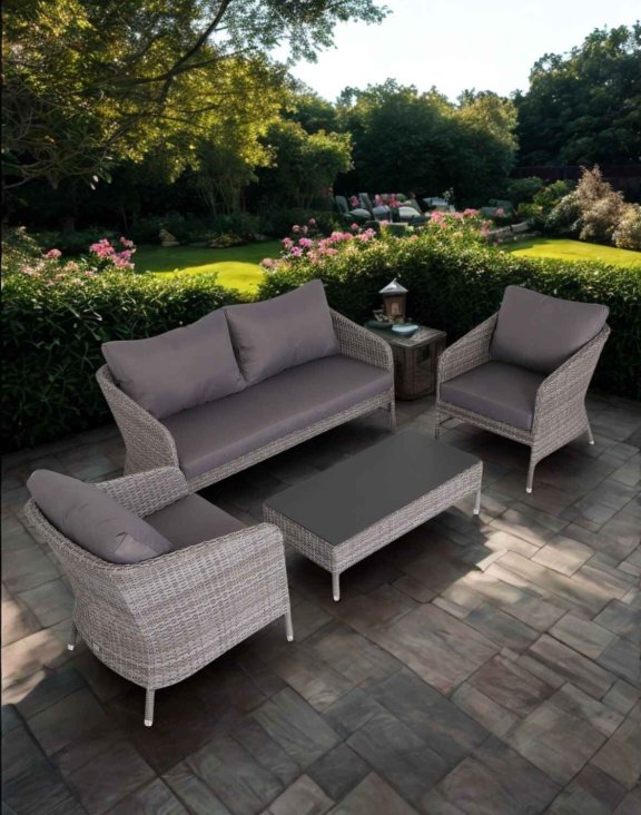 Nábytek je vyroben z technorattanu v elegantních odstínech šedé, zesílen hliníkovým rámem. Tento set vypadá nejen stylově, ale také poskytuje maximální pohodlí pro čtyři osoby.