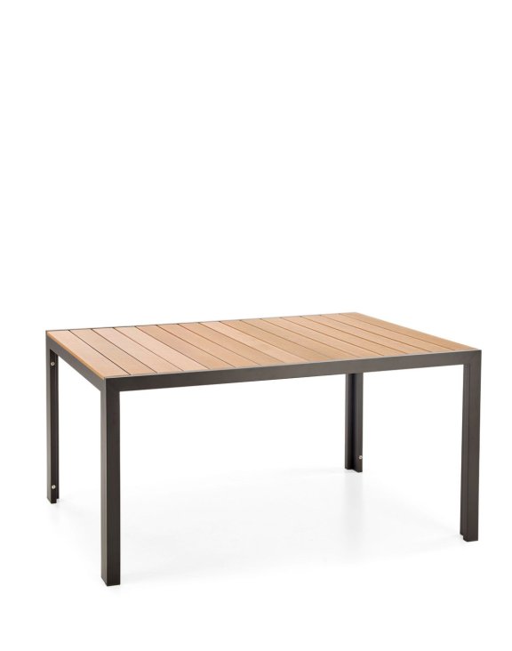 Deska ve hnědé barvě je vyrobena z polystyrenu, který věrně imituje dřevo, ale zároveň je odolný vůči povětrnostním vlivům. Konstrukce z černého hliníku zajišťuje stabilitu, dlouhou životnost a podtrhuje moderní vzhled nábytku.