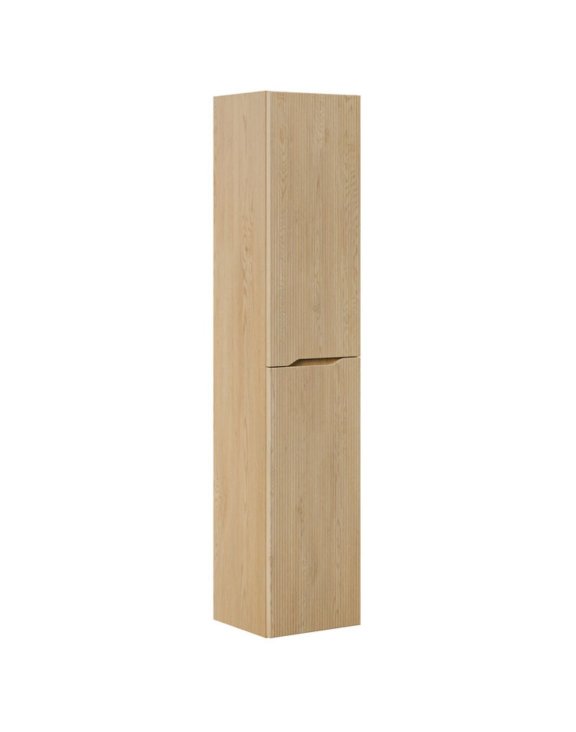 Závěsná koupelnová skříňka – vysoký sloupek s drážkovanými čely v dekoru dub cremona. Model ideální do koupelny ve skandinávském, eko, japandi nebo moderním stylu.