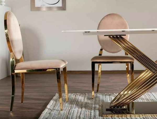 Pevná konstrukce na zlatých, lesklých nohách zajišťuje stabilitu a odolnost, zároveň však propůjčuje židli exkluzivní vzhled.