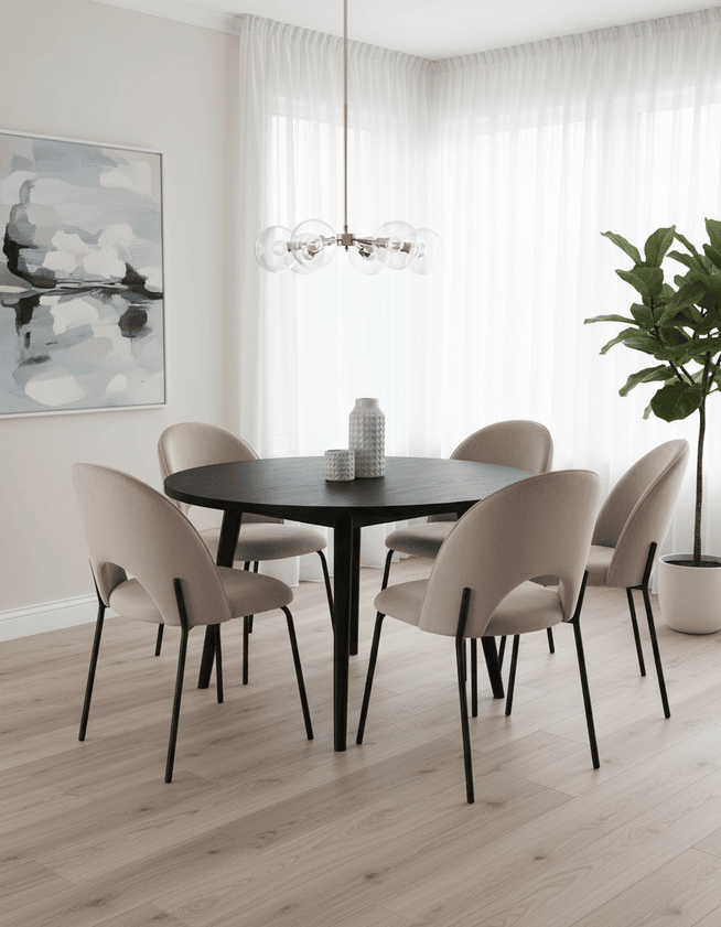 Jídelní židle Molly Black v béžové barvě s černými nohami a měkkým čalouněním. Zajímavý tvar opěráku zapadá do moderních trendů interiérového designu.